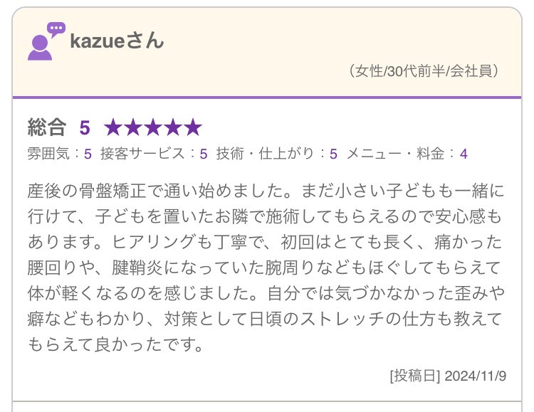 今回、産後骨盤矯正を受けて1回で体が楽になりました。